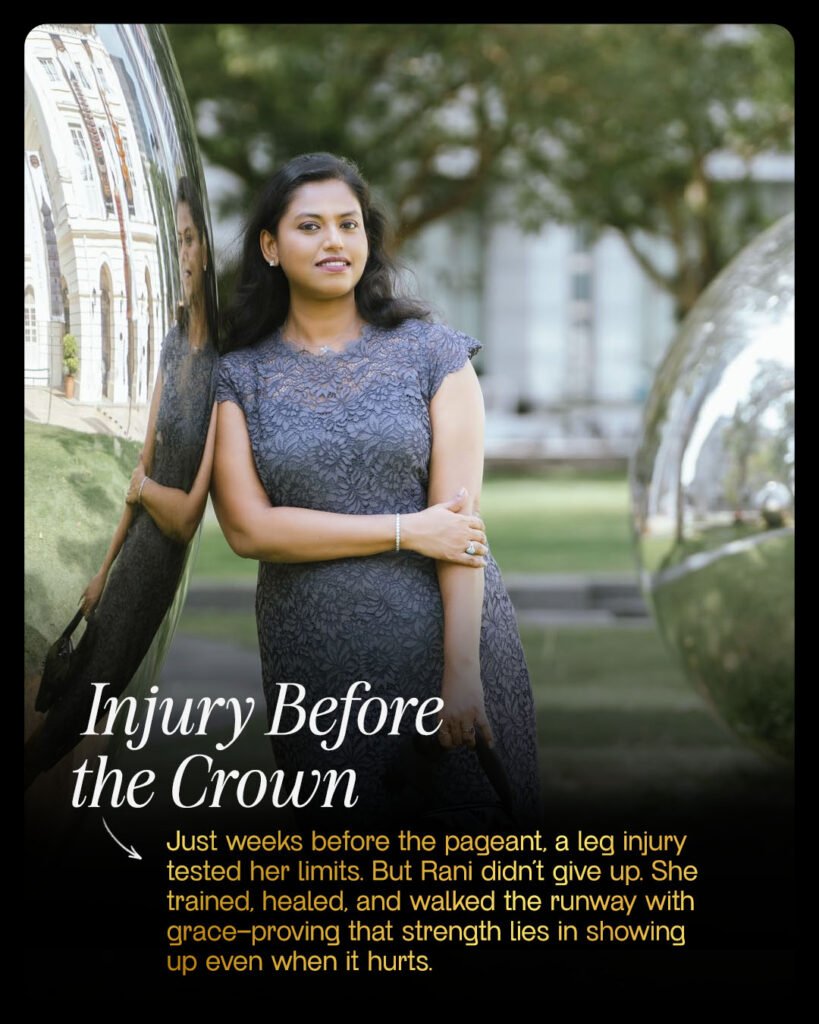 The fashion world presented its own set of challenges. Walking the runway, representing brands, and participating in Mrs. India Worldwide – Mrs. South Asia 2024 was a dream she pursued with passion. However, just weeks before the pageant, she suffered a serious leg injury. The setback was physically and emotionally challenging, but giving up was never an option. Through determination, discipline, and sheer willpower, she pushed through, competed with grace, and emerged victorious. That moment reinforced her belief that true strength lies in overcoming adversity.