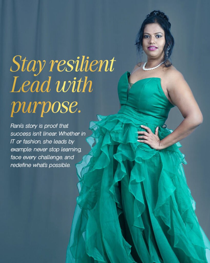 One experience that truly defined Rani’s journey and shaped her perspective is the culmination of her work in the IT industry combined with her transition into the world of fashion and modeling. Throughout her career, she has embraced every challenge as an opportunity to learn and grow, whether it was moving up the ranks from an IT engineer to Senior Project Manager or transitioning industries—from education and retail to banking.
